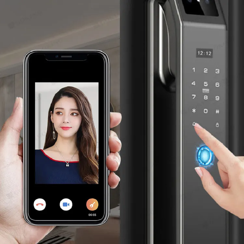 The smart door lock can be used on wooden doors and iron doors. It can be unlocked by fingerprint, password, card, mobile app.