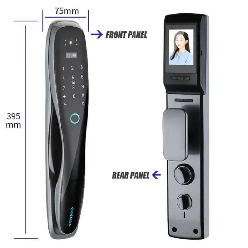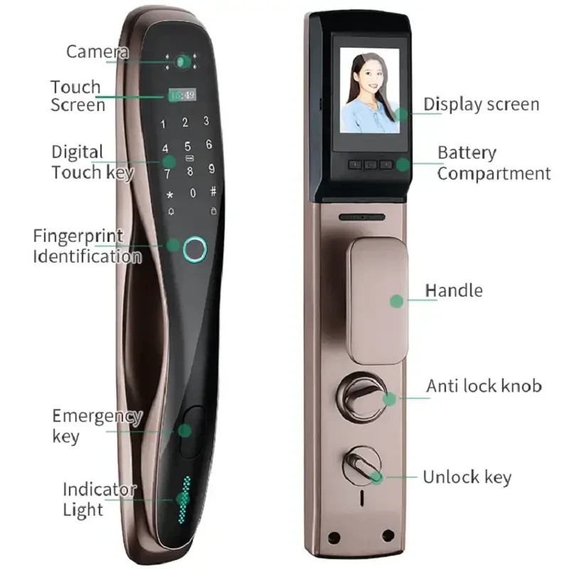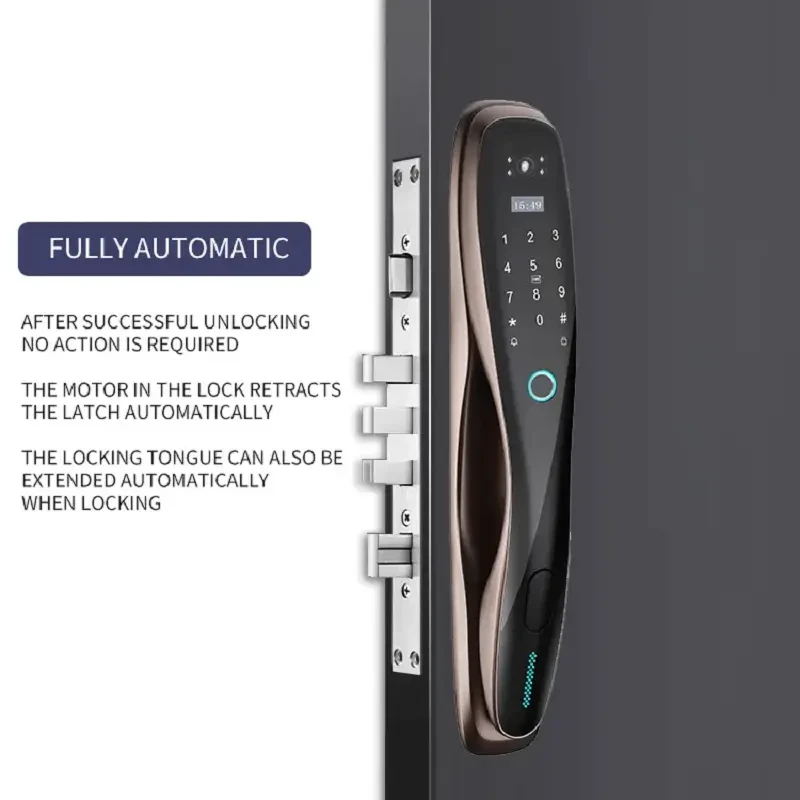 Smart life APP, you could check the records, also you can share the temporary code/Ekey with visitors, nannies, house keepers, tenants, guests, etc. Automatic door lock without handle, you only need to press the virtual button to lock the door when you go out. Emergency battery back-up, this electronic door lock would alarm if it is in low battery, you could temporary charging your lock by power bank or any power source with micro-USB port. Support remote via APP, convenient but safe?Semiconductor fingerprint recognition, refuse to copy the prosthesis fingerprint.. 1. 5 unlock ways: Fingerprint, Password, IC Card, Mechanical Key ,APP 2. Carved alloy Material Built Strong enough to protect your home; 3. Locking & Unlocking automatically with the newest automatic technology to free your hands; 4. Indoor double lock knob gives you one more safeguard; 5. Emergency power supply in case of lost power; 6. Built in Rechargeable lithium battery. Low battery warming. One time full charge can work about 3 month. 7. English Voice and menu 8. Query unlock records in the lock 9. Infrared Sensor Camera make it also can work well in dark environment 10. Suit for Lots of door type: Wooden door, stainless steel door, bronze door, Double door, Old-fashioned security doors 11. Left Open and Right Open All compatible