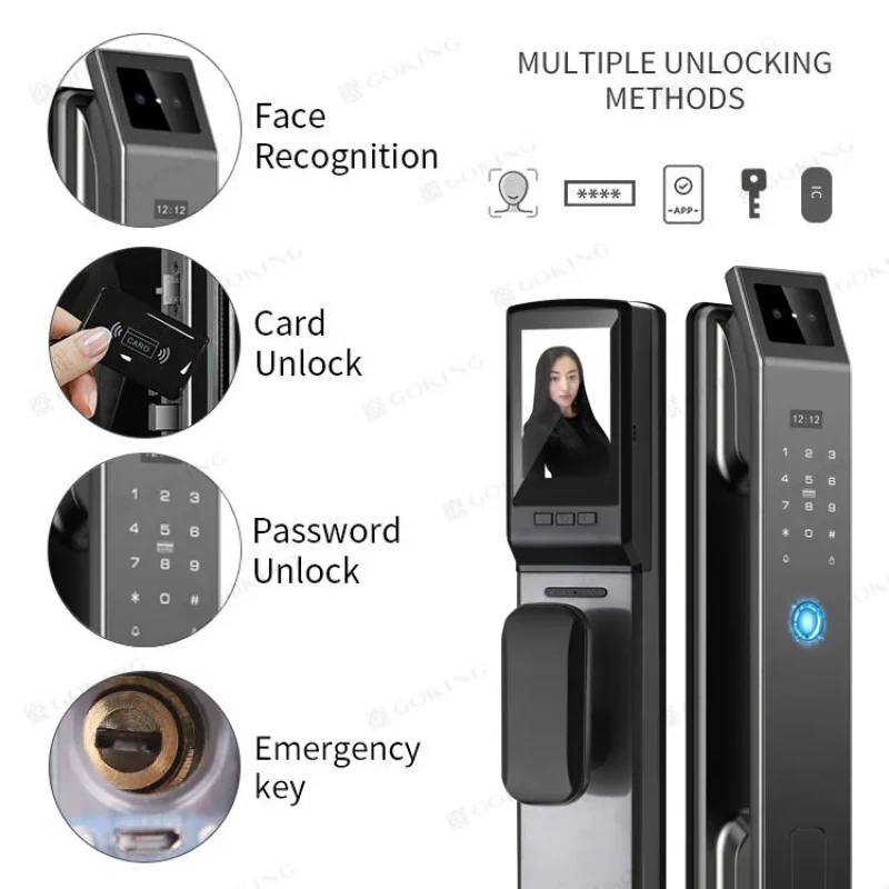 The smart door lock can be used on wooden doors and iron doors. It can be unlocked by fingerprint, password, card, mobile app.